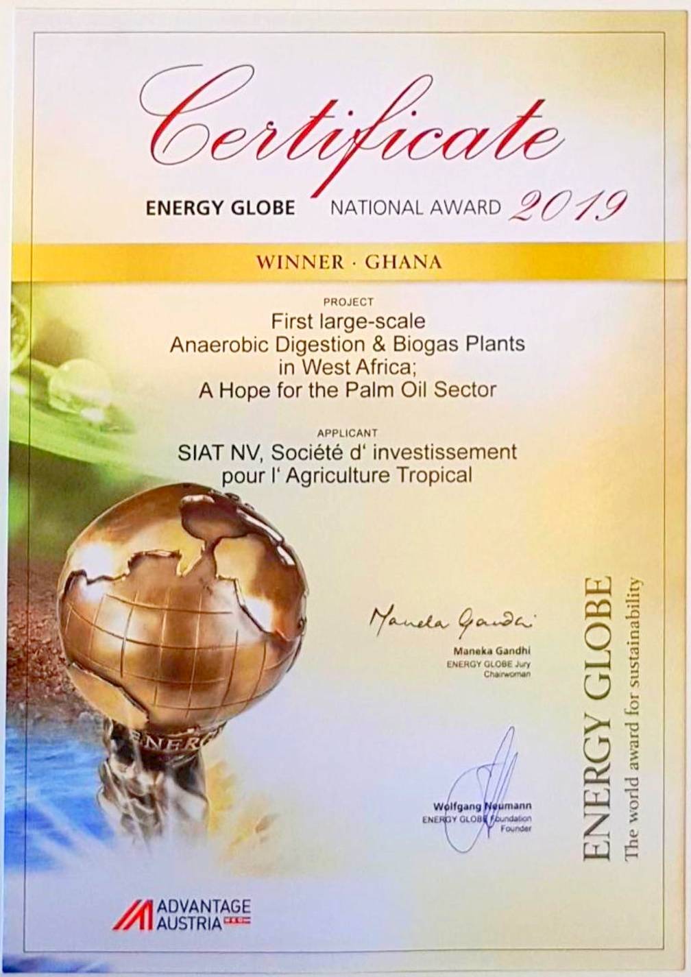 In recent years, the Siat Group has invested heavily in these fields (see Focus on co-generation).In 2018, the group was awarded the prize of: "Best International Agricultural Plant – Siat, First Large Scale AD & Biogas Plants in West Africa: A Hope for the Palm Oil Sector", awarded jointly by the World Biogas Association and the United Kingdom.